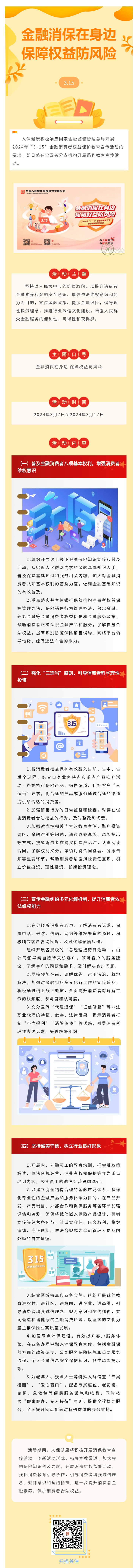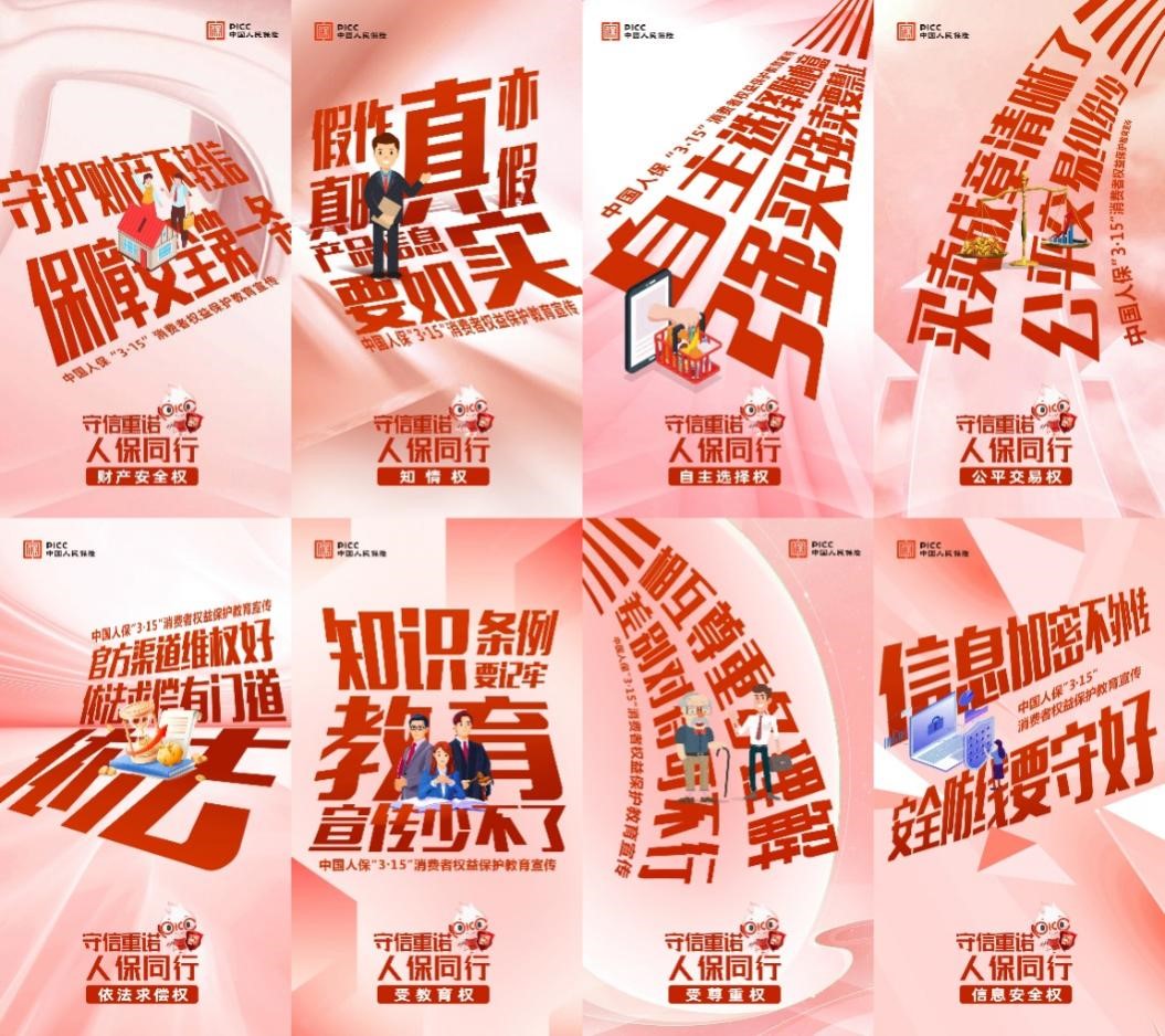 一心为民铸就诚信品质,全心服务保障消费者权益。2024年3月15日,集团正式发布中国人保消费者权益保护文化,包括文化标语(守信重诺 人保同行)、宣传片、主视觉、形象等。本次发布既是贯彻落实中央金融工作会议、中央经济工作会议精神的实际行动,也是落实国家金融监督管理总局将消保文化纳入企业文化建设相关规定以及“3·15”消费者权益保护教育宣传活动的重要举措,夯实了构建“全员参与”“全流程融入”的“大消保”工作格局的文化基础。