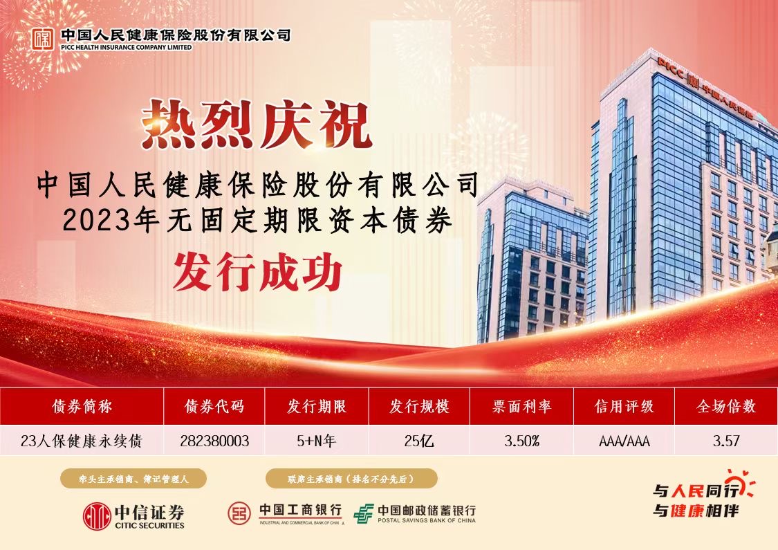 2023年12月7日,人保健康在全国银行间债券市场成功簿记发行集团内首单、行业内第一批保险公司无固定期限资本债券,期限5+N,规模25亿元,票面利率3.5%。