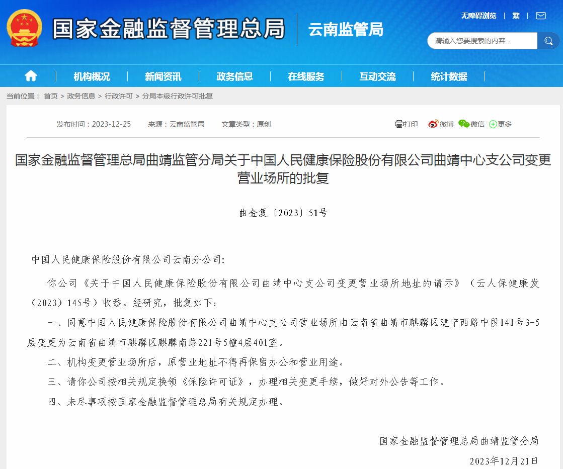 经国家金融监督管理总局曲靖监管分局批准同意变更营业场所地址,现予以公告。