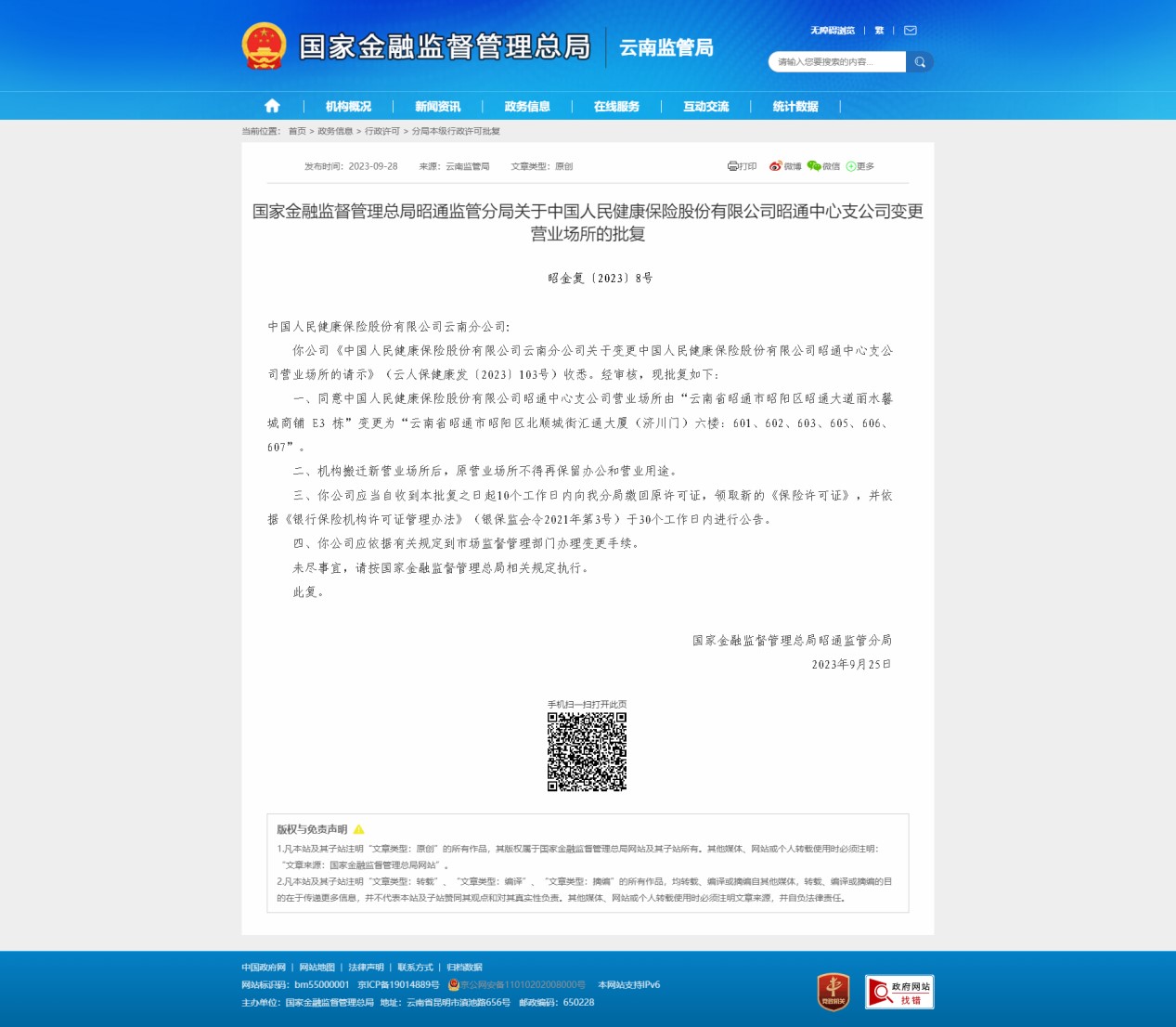 → 关于中国人民健康保险股份有限公司云南昭通支公司换领《保险许可证》的公告