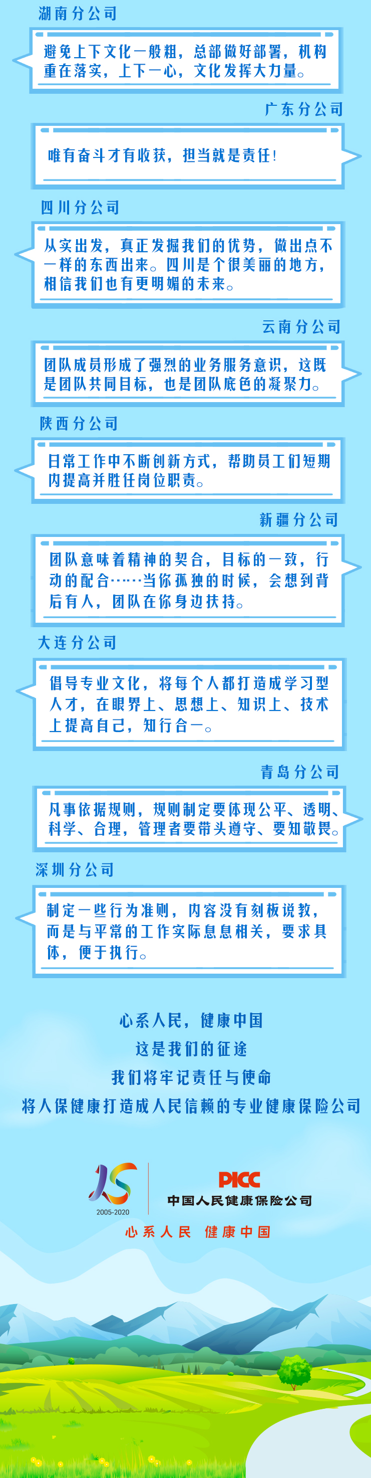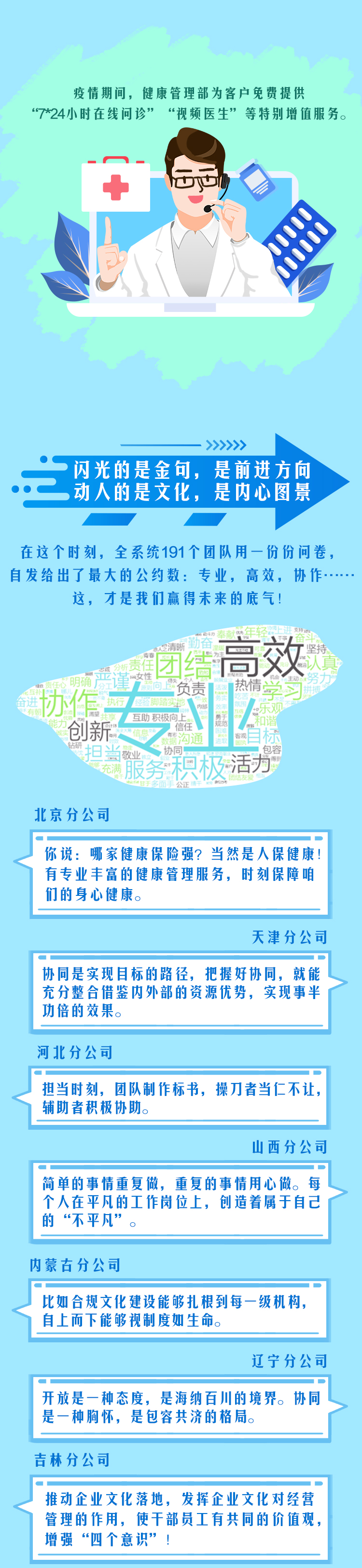 2020年是全面建成小康社会的收官之年,是公司深入推进商业模式变革的关键之年。华总勉励全体干部员工,既要仰望星空,更要脚踏实地,把握新机遇、应对新挑战,运用新打法、实现新目标,紧紧围绕“重构”、“提升”、“激活”三个关键词,大力弘扬“奋斗、担当、专业、开放、协同”的职业精神,以奋斗成就事业、以担当彰显责任、以专业创造价值、以开放扩展格局,以协同凝聚力量,并将其作为我们迎接挑战、砥砺奋进的力量之源,在新时代健康中国建设的伟大征程中建新功成大业!