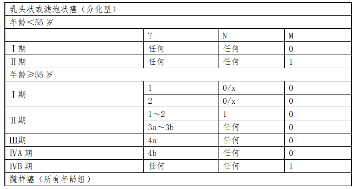 TNM 分期采用 AJCC 癌症分期手册标准,T 指原发肿瘤的大小、形态等;N 指淋巴结的转移情况;M 指有无其他脏器的转移情况。需要注意,不同年龄段的客户罹患乳头状或滤泡状甲状腺癌的分期会有一定差异,具体判定标准如下图所示。